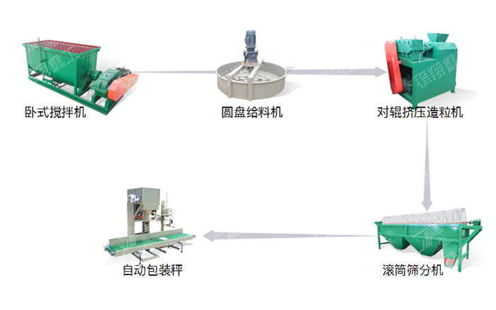 該復(fù)合肥生產(chǎn)線主要的設(shè)備有:臥式攪拌機(jī)1臺(tái)、盤式給料機(jī)1臺(tái)、對(duì)輥擠壓造粒機(jī)4臺(tái)、滾筒篩分機(jī)1臺(tái)、自動(dòng)包裝秤1臺(tái)。