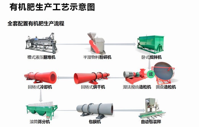 粉狀有機肥加工設(shè)備成套設(shè)備主要包括:有機肥翻堆機、半濕物料粉碎機、臥式攪拌機、滾筒篩分機、自動包裝秤。