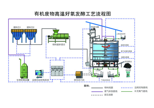 有機(jī)肥發(fā)酵罐好氧發(fā)酵工藝流程為:物料收集(秸稈、糞便)——混合攪拌——發(fā)酵罐好氧發(fā)酵,具體的工藝流程如下圖所示: