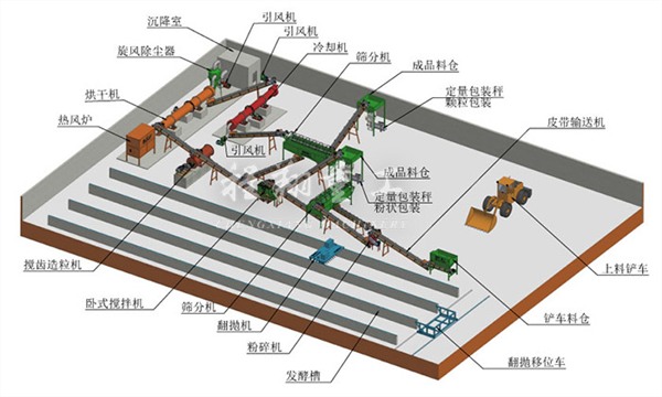 粒狀有機肥料生產線所需設備一般有:1)鏟車、2)翻堆機、3)定量給料震動料倉、4)粉碎機、5)滾筒篩分機、6)皮帶輸送機、7)電子動態(tài)配料稱(可選)、8)混合攪拌機、9)造粒機、10)滾筒烘干機、11)滾筒式冷卻機、12)噴漿包膜機(可選)、13)自動定量包裝機