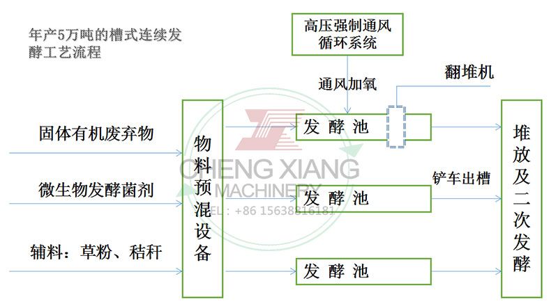 如工藝流程圖所示,每天將畜禽糞便等固體有機(jī)廢棄物與秸稈等輔料混合物及發(fā)酵菌劑充分混合,用鏟車均勻地送入發(fā)酵池前端(原始空池前端1/8或翻倒完騰出的池前端1/8),發(fā)酵物料在池內(nèi)堆積厚度為1.5~1.8米,靠高壓風(fēng)機(jī)強(qiáng)制通風(fēng)和翻堆時(shí)物料與空氣接觸提供的氧氣進(jìn)行連續(xù)好氧發(fā)酵,使發(fā)酵物料快速腐熟、去水、干燥,發(fā)酵周期7-8天。在翻堆機(jī)縱橫向行走機(jī)構(gòu)的運(yùn)送下,垂直提升機(jī)構(gòu)將發(fā)酵物料從池內(nèi)挖起提升到水平輸送機(jī)構(gòu)上,水平輸送機(jī)構(gòu)將發(fā)酵物料輸送一段距離(8-10米)后落入池中,這樣發(fā)酵物料就在池內(nèi)產(chǎn)生一定的位移,使物料在池內(nèi)有規(guī)律、等距離的漸進(jìn)式后移,每天從發(fā)酵池尾端將發(fā)酵好的物料(一天的處理量,池長的1/8)用鏟車運(yùn)走,將發(fā)酵池前端騰出的空間(一天的處理量,池長的1/8)補(bǔ)充新的發(fā)酵物料,從而形成了一種連續(xù)的發(fā)酵過程。發(fā)酵翻堆過程實(shí)現(xiàn)了全自動(dòng)智能化控制。發(fā)酵后的物料堆成料堆儲(chǔ)存的同時(shí)進(jìn)行二次發(fā)酵,進(jìn)一步腐熟并去除部分水分。堆制一段時(shí)間(根據(jù)生產(chǎn)任務(wù)及場地決定)后對其進(jìn)行篩選、磁選去除其中的石塊、鐵件等,調(diào)整水分(曬干或烘干)即可作為粉狀有機(jī)肥銷售或用作有機(jī)肥造粒原料。