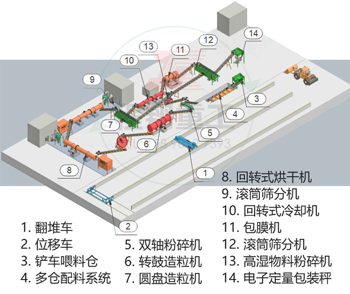 程翔重工為客戶設(shè)計(jì)的年產(chǎn)10萬(wàn)噸的豬糞復(fù)混肥料生產(chǎn)線工藝流程圖: