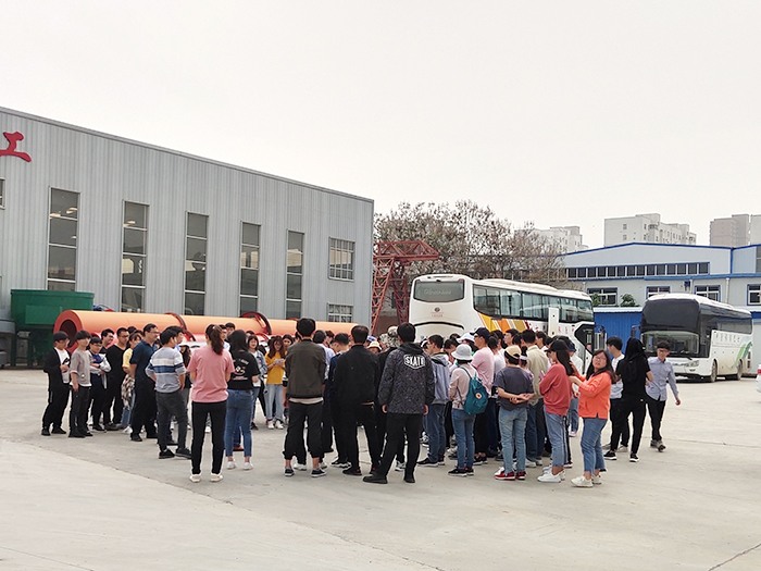 講解員在為師生講解不同型號的滾筒烘干機以及冷卻機之間的區(qū)別